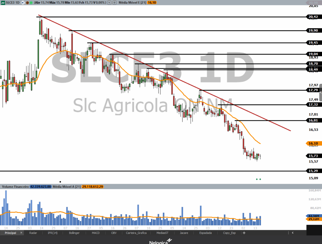 No curto e médio prazo o ativo está em tendência de baixa e opera em formação de LTB (Linha de Tendência de Baixa) que foi traçada em vermelho no gráfico diário abaixo. O próximo suporte fica em 15,29 (fundo deixado em julho de 2022). Já as próximas resistências ficam em 16,10 (MME21), 16,81 e 16,90 (LTB).