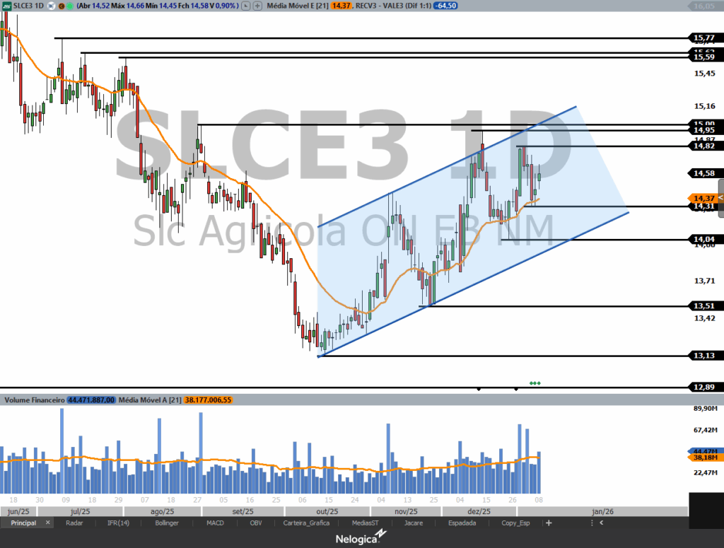 No médio prazo entrou em formação de canal de alta que foi traçado em azul no gráfico diário abaixo. A linha de suporte desse canal fica em torno de 13,95 e se for testada pode abrir uma oportunidade de compra no Swing Trade. As próximas resistências ficam em 14,82, 14,95, 15,00 e 15,59. Já os próximos suportes ficam em 14,31, 14,04, 13,95 (LTA), 13,51 e 13,13.