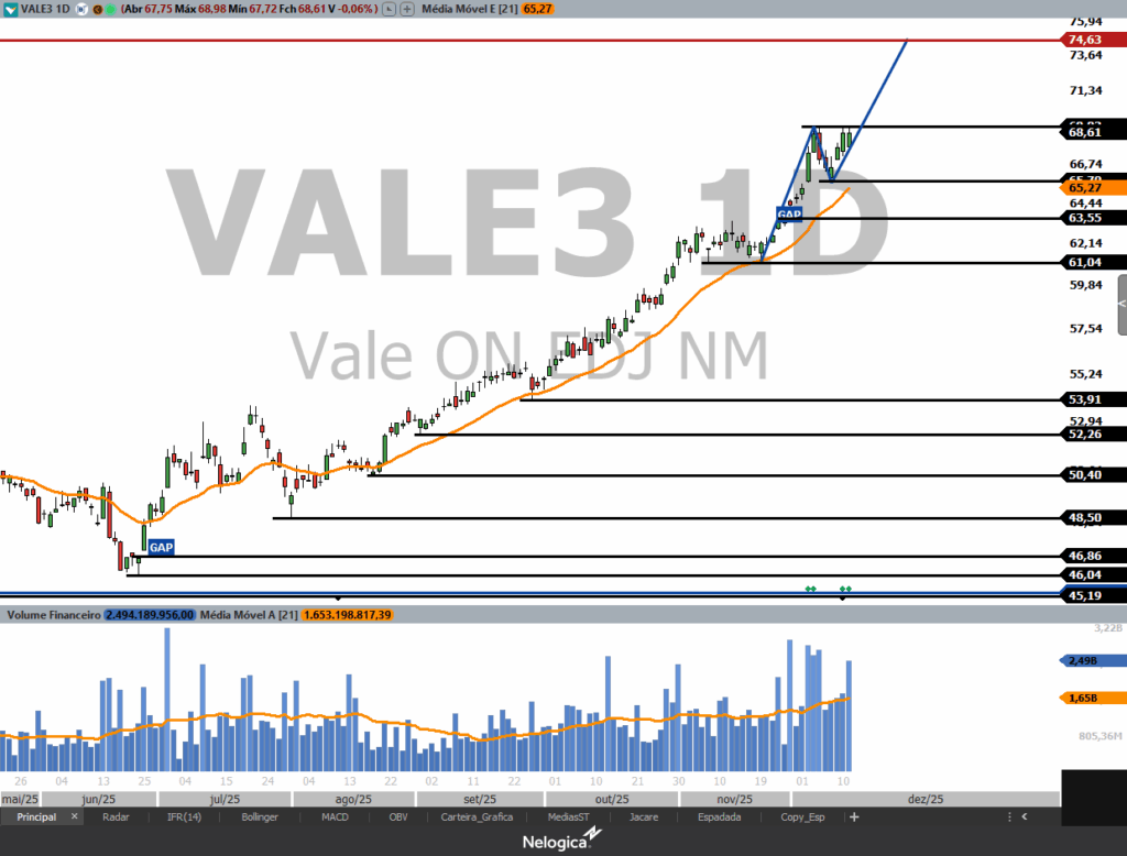 No curto e médio prazo está em tendência de alta. Se fechar acima da resistência em 69,03 irá validar um pivot de alta que foi traçado em azul no gráfico diário abaixo, o que pode abrir campo de alta até 74,63 (topo histórico deixado em maio de 2021). Os próximos suportes ficam em 65,70, 65,27 (MME21) e 63,55 (GAP).