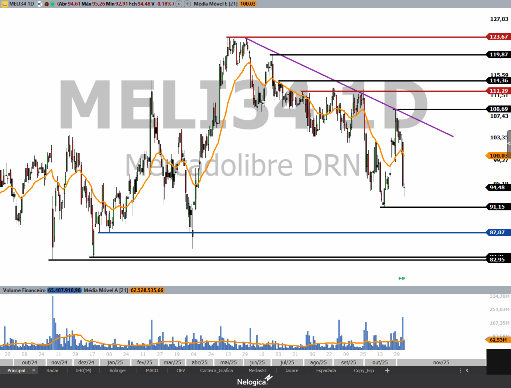 No curto e médio prazo essa BDR está em tendência de baixa e dentro de uma formação de LTB (Linha de Tendência de Baixa) que foi traçada em roxo no gráfico diário abaixo e funciona como resistência muito forte no patamar de 107,50. Os próximos suportes ficam em 91,15, 87,07 (muito forte), 83,35 e 82,95.