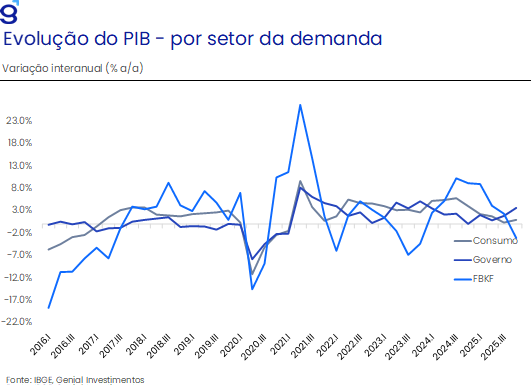 No acumulado do ano, o consumo das famílias avançou apenas 1,3%, desacelerando de maneira significativa frente aos 5,1% observados em 2024, mesmo em um ambiente ainda marcado por mercado de trabalho resiliente e medidas de estímulo à renda. Esse comportamento sugere que o elevado custo do crédito e o alto nível de endividamento das famílias vêm limitando a capacidade de expansão do consumo. De forma semelhante, embora a FBKF tenha crescido 2,9% em 2025, o resultado foi fortemente influenciado por fatores pontuais – como a importação de plataformas de petróleo e o desempenho da construção – ao passo que os segmentos mais diretamente ligados ao ciclo doméstico, como bens de capital, permaneceram fragilizados.