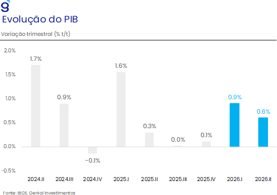Em nossa avaliação, o conjunto dos dados aponta para um enfraquecimento gradual, porém consistente, da demanda interna, tendência que deve ganhar maior relevância ao longo de 2026. Revisamos preliminarmente nossa projeção de crescimento para 2,0% no próximo ano, refletindo menor impulso esperado do consumo das famílias, mesmo diante de medidas como a ampliação da isenção do imposto de renda. Para o 1T26, projetamos avanço de 0,9% t/t, abaixo da estimativa anterior de expansão de 1,1% t/t. Esse ambiente de moderação da atividade doméstica, aliado às revisões nas séries anteriores e ao carrego estatístico limitado de 0,2% para 2026, reforça nossa avaliação de que o ciclo econômico entra em fase mais madura, abrindo espaço para o início do processo de afrouxamento monetário na próxima reunião mesmo diante do aumento das incertezas globais.