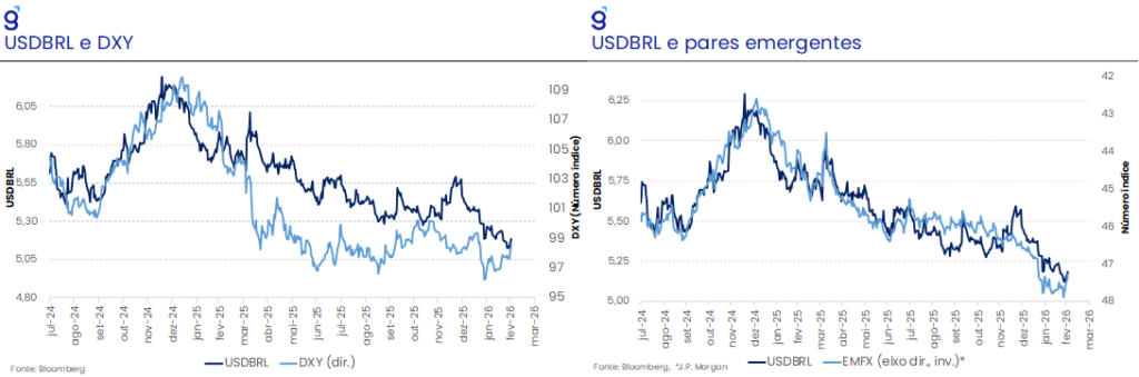 No fiscal, o superávit primário de janeiro (R$ 103,7 bi) não altera o diagnóstico estrutural: o resultado em 12 meses segue deficitário (-0,43% do PIB), com déficit nominal elevado (8,49% do PIB) e trajetória de dívida ainda desfavorável (78,7% do PIB em jan, com projeção de 83,3% em dez/26). Para 2026, projetamos déficit primário de -0,52% do PIB, o que exige ~R$ 15 bi de esforço adicional para cumprir o piso da meta, em um contexto de rigidez de despesas e baixa probabilidade de ajuste estrutural, sobretudo com a aproximação do ciclo eleitoral. No front político, as pesquisas de fevereiro sugerem ganho de tração de Flávio Bolsonaro e maior competitividade do pleito, ainda que o elevado grau de rejeição ao sobrenome Bolsonaro mantenha Lula como favorito no cenário-base. O piso de votos alto em ambos os polos tende a preservar incerteza e volatilidade ao longo de 2026, com potencial de repercussão sobre prêmios de risco e câmbio.
