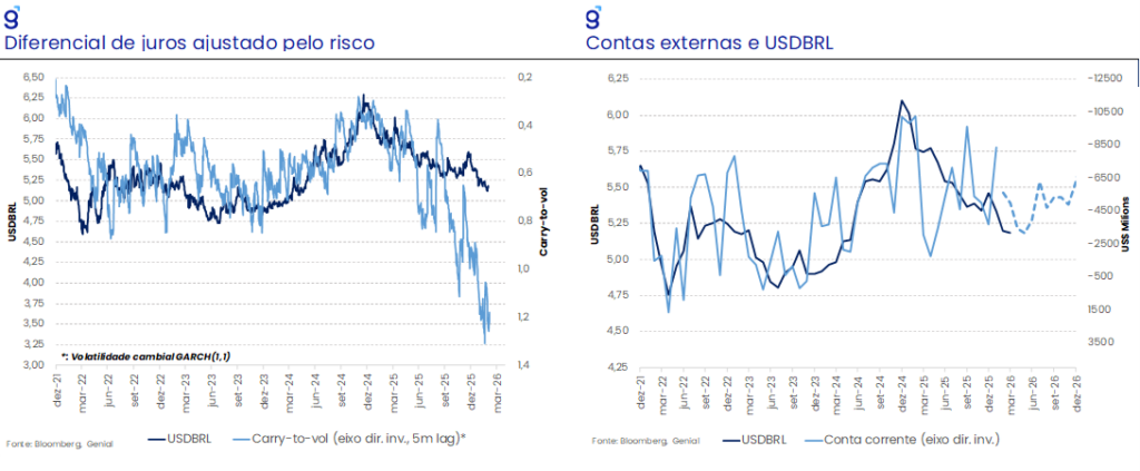 Entre janeiro e fevereiro, o real seguiu apreciando, com o dólar médio na janela saindo de R$5,33 para R$5,20. Agora, passamos a ver pouco espaço para consolidação abaixo de R$5,20 no curto prazo, dado o fortalecimento recente do DXY e menor depreciação do real em comparação com os pares. O déficit em conta corrente de janeiro (-US$ 8,3 bi) veio pior do que nossa projeção ( -US$ 5,2 bi), sugerindo viés de depreciação para ~R$5,40 até o fim do ano, acima do patamar anterior de ~R$5,25 mapeado em dezembro. O quadro foi parcialmente compensado por IDP mais robusto e, sobretudo, por um carry-to-vol ainda atrativo, o que tende a limitar movimentos de alta mais intensos, ao menos em termos comparado com os pares emergentes. Com o conflito, nossos modelos passaram a apontar um DXY de 99 (vs. 97) no fim do ano, reduzindo a assimetria baixista vista em janeiro. Mantemos USD/BRL ~R$5,30 no 1S26, com leve revisão de alta para o fim de 2026 (R$5,42 → R$5,45).