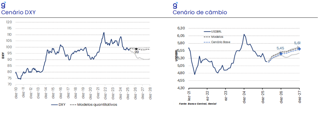 No final de fevereiro, as tensões geopolíticas no Oriente Médio se intensificaram com a consolidação de conflitos armados entre Estados Unidos, Israel e Irã. A moeda americana se fortaleceu, beneficiando-se de um movimento global de risk-off dos investidores, indo na contramão da tendência de depreciação observada ao longo dos últimos meses. No impacto, o DXY se apreciou em torno de 1,0%, e movimentos de magnitudes similares foram observados no VIX e ouro. Com isso, nossos modelos passaram a sugerir um DXY em 99,0 pontos ao invés de 97,0 pontos para o fim do ano, uma vez que o evento recente desfaz boa parte da assimetria baixista observada no cenário de janeiro. Com isso, mantemos nossa premissa de um câmbio de R$/US$ 5,30 ao longo dos dois primeiros trimestres do ano, e adiciona-se ligeira revisão de alta na projeção para o fim de ano, saindo de R$/US$ 5,42 para R$/US$ 5,45.