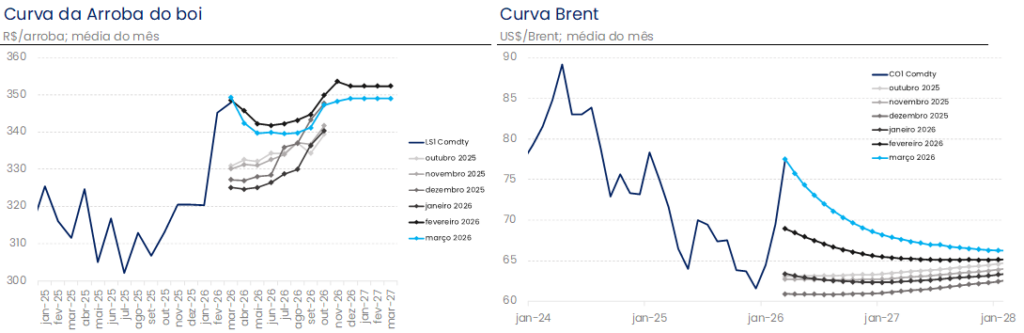 A desinflação doméstica observada nos últimos seis meses contou com condições de oferta favoráveis. Dentre elas, a taxa de câmbio se apreciou consistentemente, o preço do petróleo chegou a ficar abaixo dos US$ 60,0 por barril no começo de janeiro, as commodities agrícolas sustentaram tendência de queda e a cotação da carne bovina se manteve controlada no mercado doméstico. Todos esses fatores contribuíram para queda em alimentação no domicílio e cortes no preço do combustível pela Petrobrás, auxiliando na tendência de desinflação nos demais grupos via canais mais indiretos. Agora, o cenário começa a apontar para outra direção. Entre janeiro e o primeiro dia útil de março, o Petróleo aumentou cerca de 20%, saindo de US$ 64,5 dólares por barril (média de janeiro) para US$ 77,0 (fechamento 2 de março). Adicionalmente a esse movimento, a taxa de câmbio se depreciou e o DXY reverteu trajetória de queda. Mais ainda, a arroba do boi em março ficou próxima de R$ 350,0, isto é, 6,0% acima dos R$ 330,0 precificados pelo mercado no final de dezembro, com deslocamento para cima da curva em todos os seus vértices.