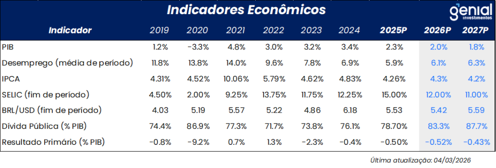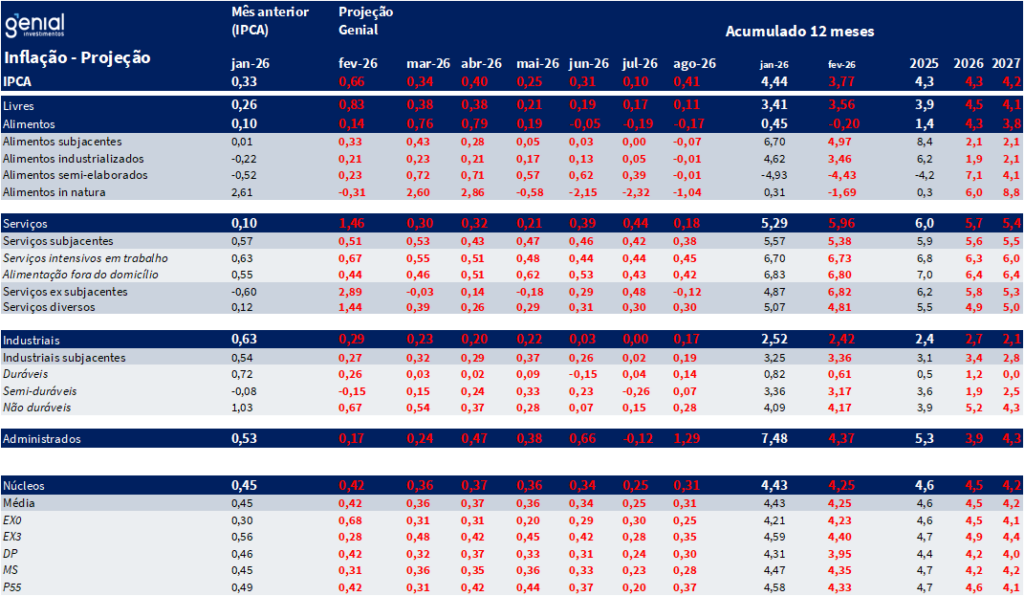 Na mesma direção, a taxa real de juro necessária para desaquecer a economia parece ser substancialmente mais elevada do que as estimativas usuais de taxa neutra (em torno de 5,0%), podendo ser reflexo das políticas de estímulo à demanda agregada que acabam contrabalanceando o efeito da contração monetária. Nesse contexto, seguimos enxergando uma inflação de serviços pressionada no médio prazo. Com isso, mantemos a nossa projeção de IPCA em 4,3% para 2026 e 4,2% para 2027.