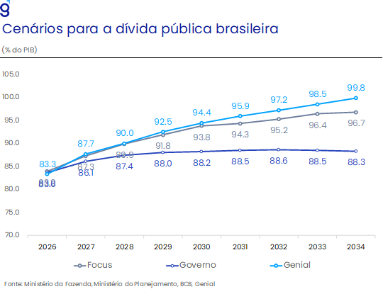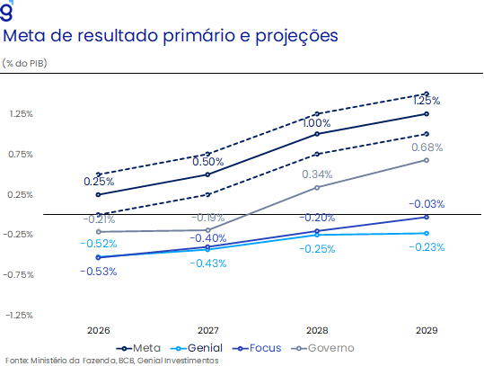 Para o restante de 2026, o cenário permanece desafiador. Mesmo após o cumprimento formal da meta em 2025 – viabilizado por exclusões relevantes do cálculo – projetamos déficit primário de R$ 69,6 bilhões (-0,52% do PIB) neste ano, o que demandaria esforço adicional de cerca de R$ 15,0 bi para atingir o limite inferior da meta de resultado zero. Em um ambiente de desaceleração da atividade e aproximação do ciclo eleitoral, a tendência é de maior dependência de medidas arrecadatórias e receitas extraordinárias, sem avanço estrutural pelo lado das despesas. Nesse contexto, seguimos avaliando que a estabilização da dívida pública não deverá ocorrer nos próximos anos, mantendo o risco fiscal elevado e pressionando os prêmios de risco domésticos.