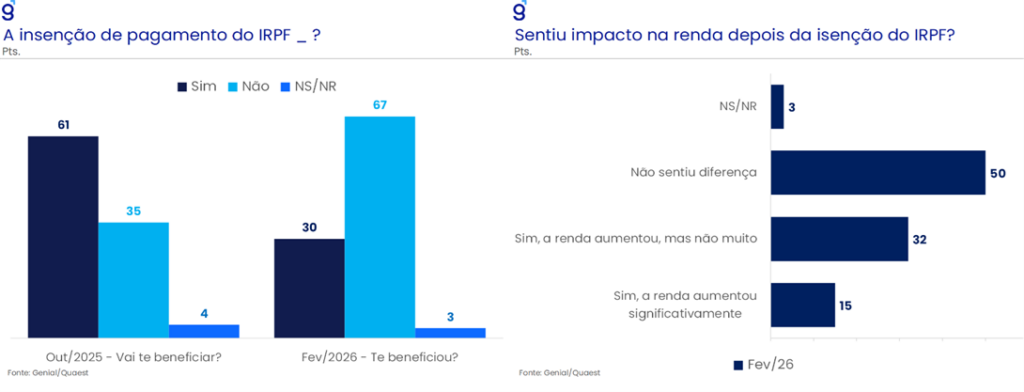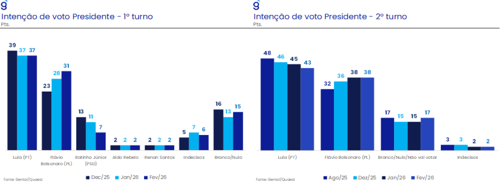 Em nossa avaliação, o desempenho menos favorável do presidente em fevereiro reflete a combinação de ruídos envolvendo os casos do Banco Master e do INSS, além de uma possível superestimação do impacto político da isenção do IRPF para rendimentos de até R$ 5,0 mil. A pesquisa indica que corrupção permanece como a terceira maior preocupação do eleitorado (17,0%) e que o efeito percebido da isenção ficou aquém do esperado. Ainda assim, apesar do momento mais favorável à candidatura de Flávio Bolsonaro e da ausência de maior competitividade de outros nomes no campo oposicionista, o elevado grau de rejeição ao sobrenome Bolsonaro mantém Lula como favorito em um cenário base. O pleito, contudo, tende a ser competitivo, com piso de votos elevado em ambos os polos, o que deve preservar um ambiente de incerteza política e potencial volatilidade ao longo de 2026.