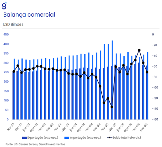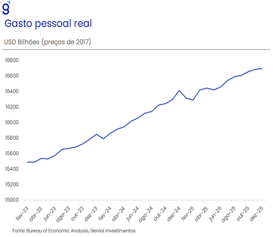 A inflação continuou pressionada, com o índice de preços de gastos com consumo (PCE price index) desacelerando menos do que o esperado na virada do 3º para o 4º trimestre de 2025, saindo de 3,8% t/t para 3,6% t/t em termos anualizados quando a expectativa era de uma redução de 1,0 p.p., para 2,8% t/t (Bloomberg). Já o núcleo do PCE, que exclui energia e alimentos, deveria ter desacelerado de 2,9% t/t para 2,6% t/t, mas também frustrou as estimativas, caindo para apenas 2,7% t/t.
