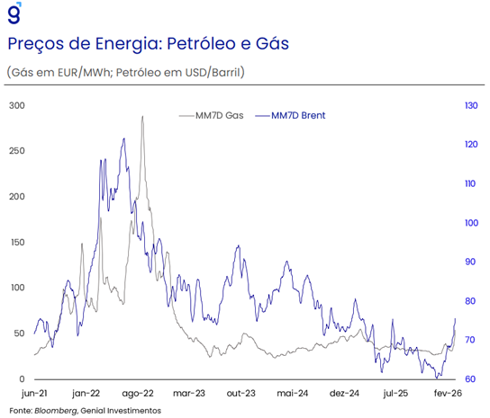 No cenário externo, a adoção de uma tarifa uniforme de 10% nos EUA (com validade de 150 dias) elevou a incerteza sobre a política comercial e seus efeitos sobre preços e atividade econômica, sobretudo pela dúvida sobre a postura do Congresso e pelo potencial de recomposição de estoques no período. Em paralelo, a escalada do conflito no Oriente Médio adicionou um choque clássico de “risk-off”: dólar e volatilidade global se elevaram e o petróleo voltou a subir de forma relevante, reintroduzindo risco altista para a inflação global (e, por extensão, para o DXY e condições financeiras). Para o Brasil, o canal mais direto é via energia e câmbio: petróleo mais alto eleva o risco de repasse a combustíveis, enquanto o dólar mais forte reduz o espaço para apreciação do real, pressionando expectativas e exigindo maior prudência na calibragem do ciclo de cortes do Copom. No caso europeu, o gás (GNL) tende a ter um maior impacto do que o petróleo por conta de os países do continente terem passado a recorrer justamente aos países do Golfo Pérsico como principais fornecedores depois que eclodiu o conflito entre a Rússia e a Ucrânia em 2022.