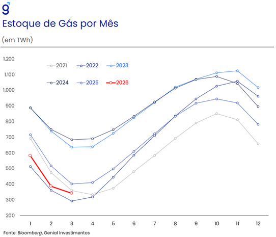 No caso europeu, o gás (GNL) tende a ter um maior impacto do que o petróleo por conta de os países do continente terem passado a recorrer justamente aos países do Golfo Pérsico como principais fornecedores depois que eclodiu o conflito entre a Rússia e a Ucrânia em 2022, com os países europeus passando a deixar de comprar commodities energéticas da Rússia. Apesar dos estoques de gás estarem baixos, a sazonalidade do choque atual é favorável, visto que o continente está saindo do período de inverno. O maior problema desse choque sobre a economia europeia ao nosso ver é fazer os países da região atravessarem outra disparada nos custos, especialmente os industriais.