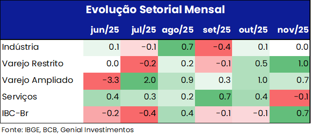 Os indicadores de atividade divulgados ao longo do último mês seguem apontando para um desempenho heterogêneo entre os principais setores da economia, em linha com nossa avaliação de que o processo de desaceleração permanece bastante gradual. Com base nos dados de novembro – que abrangem IBC-Br, varejo (PMC), serviços (PMS) e indústria (PIM) – o conjunto de informações sugere alguma recomposição do ritmo de atividade no quarto trimestre, após a perda de fôlego observada ao longo do segundo semestre.