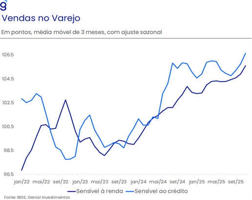 O varejo se destacou como o principal vetor positivo no período, com avanço expressivo das vendas em novembro, interrompendo uma sequência prolongada de estabilidade e sinalizando recuperação do consumo no fim do ano. Embora parte desse movimento esteja associada a fatores sazonais, como a Black Friday, o resultado também reflete a resiliência do mercado de trabalho, que segue sustentando a demanda das famílias. Esse desempenho se traduziu em aceleração das médias móveis trimestrais, reforçando a leitura de melhora marginal da demanda ao longo do 4T25. Além disso, a recuperação mostrou caráter relativamente disseminado entre as categorias, com continuidade da expansão nos segmentos mais sensíveis à renda e sinais de retomada em atividades mais dependentes de crédito, mesmo em um ambiente de política monetária ainda contracionista.