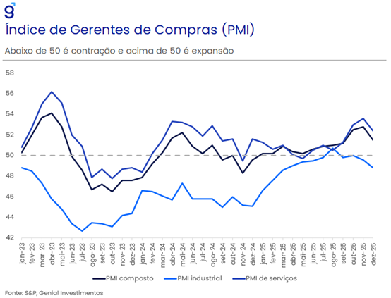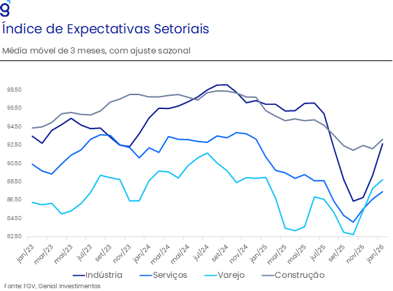 Por fim, chama atenção a recuperação das expectativas dos empresários nos principais setores da economia, após sucessivos meses de deterioração. Esse movimento sugere melhora da percepção pelo lado produtivo e reforça a leitura de que a economia apresentou sinais de recuperação no último trimestre de 2025. Em conjunto, os dados corroboram a avaliação de que a atividade encerrou o ano com alguma recomposição do ritmo no 4T25, sustentando o cenário de arrefecimento gradual, compatível com crescimento positivo, ainda que em patamar contido.