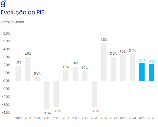 Para o início de 2026, esperamos aceleração na passagem do 4T25 para o 1T26, refletindo estímulos à demanda e a manutenção de um mercado de trabalho aquecido, com ganhos reais de renda. Nossos modelos apontam expansão de 1,2% t/t no 1T26, ajudando a evitar desaceleração mais pronunciada. Nos trimestres seguintes, a proximidade do ciclo eleitoral tende a reforçar esse quadro via intensificação dos gastos dos governos central e regionais, historicamente mais elevados no período pré-eleitoral. Nesse contexto, projetamos que a economia brasileira cresça 2,1% em 2026, mantendo desempenho resiliente apesar do aperto monetário ainda vigente.