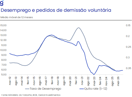Ainda assim, os dados do Caged começam a sinalizar uma perda gradual de tração à frente. Indicadores como a média móvel trimestral dos pedidos de desligamento voluntário e a razão entre salários de admissão e demissão – métricas usualmente utilizadas para avaliar o grau de aperto do mercado de trabalho – registraram o segundo recuo consecutivo na margem, sugerindo alguma moderação no ritmo de aquecimento. Apesar disso, ambos permanecem em patamares historicamente elevados, reforçando a leitura de que o mercado de trabalho segue resiliente e de que eventuais ajustes tendem a ocorrer de forma lenta e ordenada.
