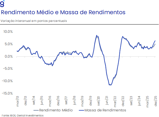 No mercado de trabalho, os dados mais recentes da PNAD Contínua e do Caged indicam que a economia brasileira encerrou 2025 em um patamar de elevada resiliência, com a taxa de desemprego atingindo mínimas históricas e a população ocupada alcançando novos recordes. Esse quadro é reforçado pela aceleração do crescimento do rendimento médio e da massa de rendimentos em termos reais, compatível com um mercado de trabalho ainda bastante aquecido.