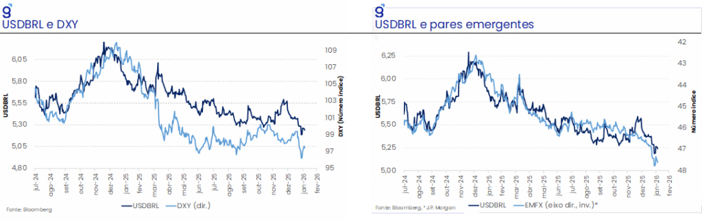 Janeiro confirmou o viés baixista de curto prazo para USD/BRL: o dólar global voltou a enfraquecer e fluxos para emergentes sustentaram um carry-to-vol atrativo. No doméstico, contas externas vieram mais benignas (exportações fortes; importações crescendo menos), reforçando a melhora na tendência cambial de médio prazo. Assim, passamos a considerar um câmbio de R$ 5,30/US$ no 1S26 ao invés de R$ 5,50/US$, sob a premissa de um DXY estável em 97,0 pontos (com modelos quantitativos sugerindo viés para 90 pontos ainda em 2026, o que adiciona assimetria baixista). Ainda assim, mantemos o cenário de alta para R$ 5,50/US$ no 2S26, com o pano de fundo eleitoral/fiscal como fonte de pressão, embora amortecido por um ambiente internacional mais favorável.