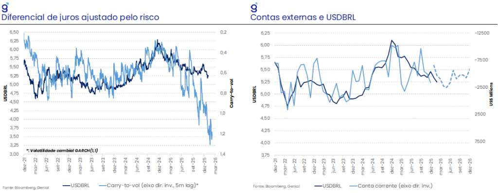 A razão carry-to-vol segue atuando como uma força de gravidade, puxando a taxa de câmbio para baixo. Apesar do elevado diferencial de juros, esperávamos um aumento da volatilidade cambial logo no início de 2026, compensando esse diferencial e diminuindo a atratividade do carry-trade. O cenário realizado, no entanto, foi de uma consolidação da tendência de baixa do câmbio devido aos elevados fluxos internacionais em direção aos emergentes, sustentando um carry-to-vol em patamar atrativo.