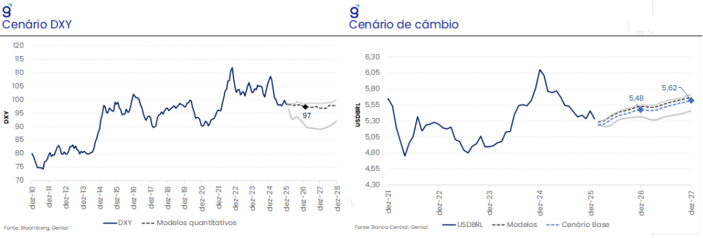 Nesse contexto, passamos a considerar uma taxa de câmbio em torno de R$ 5,30/US$ para os dois primeiros trimestres de 2026, abaixo dos R$ 5,50/US$ utilizado nas projeções anteriores. Para essa trajetória, consideramos um DXY convergindo para 97,0 pontos, limitando uma queda mais intensa da taxa de câmbio. No entanto, nossos modelos quantitativos sugerem um claro viés baixista nessa projeção, com um conjunto não desprezível destes sugerindo uma convergência para 90,0 pontos ainda em 2026, viés esse também identificado na rodada de outubro do ano passado. Naturalmente, o mesmo direcional ocorre para a taxa de câmbio, sugerindo um viés baixista para um valor mais próximo de R$ 5,35/US$ até o final do ano.