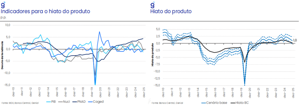 Do lado da atividade, a utilização da capacidade instalada recuou no 4T25 e as leituras recentes do CAGED vieram abaixo da tendência esperada, o que nos levou a revisar o hiato do produto de 1,5% para 1,0% para o 4T25. O mercado de trabalho, refletido pela PNAD, segue como vetor altista para nossa estimativa de hiato. Avaliamos que a taxa natural de desemprego pode, de fato, ter caído, mas o ritmo de crescimento salarial ainda é incompatível com os efeitos esperados da política monetária, sustentando um hiato do produto positivo.