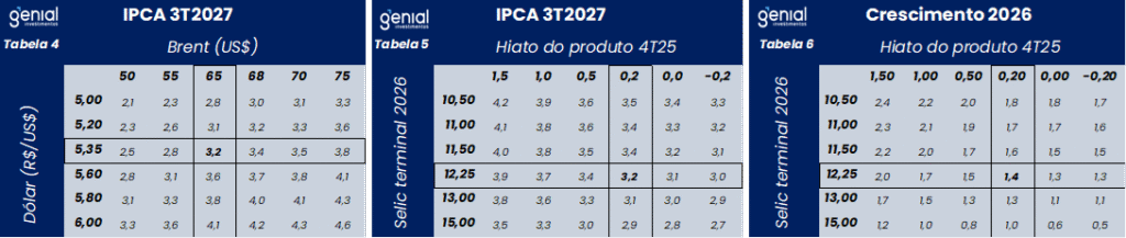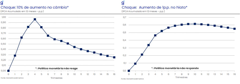 Pelas nossas elasticidades, uma depreciação cambial de 10% e um aumento de 1,0 p.p. no hiato elevam o IPCA em 95 bps e 45 bps, respectivamente, no horizonte de um ano, supondo uma política monetária parada. Dado o câmbio projetado em torno de R$ 5,30/US$ no 1S26 (vs. R$ 5,50/US$) e um hiato mais próximo de 1,0% (vs. 1,5%), revisamos o IPCA de 4,9% para 4,3% em 2026 e de 4,6% para 4,1% em 2027.