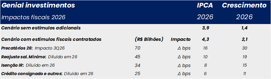 Revisamos nossas premissas e projeções devido a uma taxa de câmbio mais apreciada do que o antecipado e por um hiato do produto um pouco mais fechado. A taxa de câmbio de curto prazo considerada passou a ser R$ 5,30/US$ no 1S26 (vs. R$ 5,50/US$ no cenário anterior), enquanto revisamos o hiato do produto de 1,5% para 1,0% para o 4T25. Com base nas nossas elasticidades (10% de depreciação = +95 bps no IPCA em 1 ano; +1,0 p.p. no hiato = +45 bps), essas mudanças nos levaram a reduzir a projeção de inflação: IPCA 2026: 4,9% → 4,3% e IPCA 2027: 4,6% → 4,1%. A revisão ocorre apesar da inclusão de medidas fiscais, com impulso estimado de +40 bps no IPCA e +0,7 p.p. no crescimento em 2026; sem esses impulsos (e ainda com um câmbio indo a R$ 5,50/US$ no 2S26), estimamos IPCA 3,9% e PIB 1,4% em 2026.
