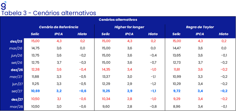 Vemos o balanço de riscos dessa projeção em linha com o do cenário de inflação. No lado baixista, destacamos: (i) desaceleração mais intensa da inflação de serviços no segundo semestre (média); (ii) maior leniência da autoridade monetária no início do ciclo (baixa); e (iii) manutenção do câmbio em R$ 5,20/US$ ao longo de todo o período eleitoral (média). No lado altista, ponderamos: (i) inflação do 1T26 acima do esperado (baixa); e (ii) reversão do câmbio em direção a R$ 5,50/US$ até o 2T26 (baixa). Dado o conjunto de riscos e as probabilidades atribuídas, avaliamos que a distribuição permanece assimétrica para baixo, com viés para uma Selic terminal mais próxima de 11,50%, mantendo cortes de 50 bps por reunião – inclusive nas duas últimas do ano.