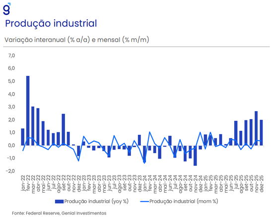 A inflação cheia, medida tanto pelo CPI quanto pelo PCE, deve desacelerar para algo em torno de 2,5% no nosso cenário base. A atividade econômica deve permanecer resiliente com perspectivas até de aceleração refletindo o fim do shutdown do governo, os impulsos fiscais da “One Big Beautiful Bill” e a agenda de desregulamentação que a administração Trump pretende implementar focada nos setores financeiro, de energia e de tecnologia. Com isso, esperamos que o PIB cresça 2,5% em 2026. Depois de anos pressionada, a atividade industrial já está dando sinais de que 2026 será um ano de retomada, com as métricas de novos pedidos e produção registrando aceleração significativa. Isso vai ao encontro do desejo do atual governo de reindustrializar os EUA.