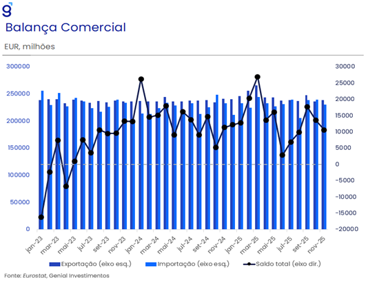 Se esse cenário se materializar, o BCE pode se ver diante de um dilema semelhante ao do Fed em 2025: calibrar a política entre sustentar atividade e emprego, de um lado, e conter a inflação, de outro. Por outro lado, a guerra comercial iniciada pelos EUA acelerou o esforço da União Europeia para concluir acordos negociados há anos – como Mercosul e Índia – que, pelo tamanho dos mercados e pela abrangência setorial, podem gerar um impulso para a atividade já no curto prazo, caso sejam ratificados rapidamente.
