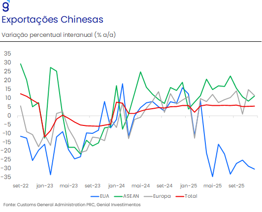 Os indicadores divulgados no último mês reforçam a leitura de que a economia chinesa inicia 2026 sob desafios relevantes. Embora o país tenha cumprido a meta oficial de crescimento de 5,0% em 2025, os principais entraves estruturais seguem praticamente inalterados – com destaque para a confiança doméstica ainda deprimida, a crise prolongada no setor imobiliário e o excesso de capacidade em diversos segmentos industriais. Nesse contexto, o começo de 2026 tende a ser particularmente desafiador, sobretudo se o governo mantiver uma meta próxima de 5,0%, o que provavelmente exigirá estímulos adicionais em um ambiente externo ainda adverso. O PIB do quarto trimestre de 2025 cresceu 4,5% a/a, desacelerando em relação aos 4,8% a/a observados no terceiro trimestre, levando o crescimento anual a 5,0% e marcando o terceiro ano consecutivo de cumprimento da meta oficial. O principal vetor de sustentação da atividade foi o setor externo: as exportações avançaram 3,9% a/a no 4T25, beneficiadas pelo desempenho robusto de dezembro (6,6% a/a), bem acima do consenso de mercado (3,1% a/a, Bloomberg). Mesmo diante da desaceleração das vendas para os Estados Unidos, o aumento dos embarques para a Europa e países do sudeste asiático (ASEAN) compensou amplamente essa perda, permitindo que as exportações chinesas crescessem 5,5% em 2025, exercendo papel central na sustentação do crescimento.