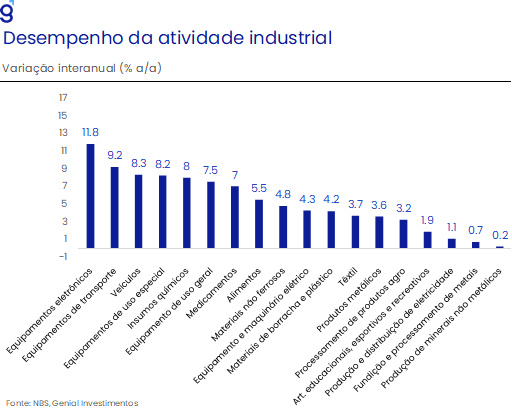 A produção industrial seguiu ancorada na resiliência das exportações, mais do que compensando a fraqueza persistente da demanda doméstica. No quarto trimestre, a indústria cresceu 5,0% a/a, com aceleração ao longo do trimestre – de 4,8% a/a em novembro para 5,2% a/a em dezembro – superando as expectativas de mercado. O desempenho foi liderado pela produção de componentes tecnológicos, beneficiada pelo ciclo global de investimentos em tecnologia, e pelos segmentos ligados ao setor automotivo, em linha com o forte avanço das exportações de veículos.