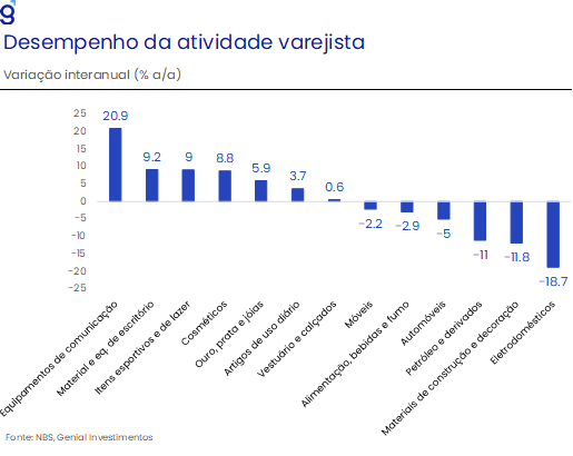 Essa fraqueza doméstica também ficou evidente no consumo, com as vendas no varejo desacelerando de forma significativa no último trimestre de 2025. O crescimento médio foi de 1,7% a/a no 4T25, ante 3,4% a/a no 3T25, enquanto em dezembro as vendas avançaram apenas 0,9% a/a, abaixo do consenso (1,1% a/a, Bloomberg), em parte devido a uma base de comparação elevada associada à introdução de subsídios no fim de 2024. O desempenho entre os segmentos permaneceu heterogêneo, com resultados mais favoráveis nas categorias beneficiadas por políticas de subsídios, contrastando com contrações relevantes nos segmentos ligados ao consumo discricionário e ao mercado imobiliário.