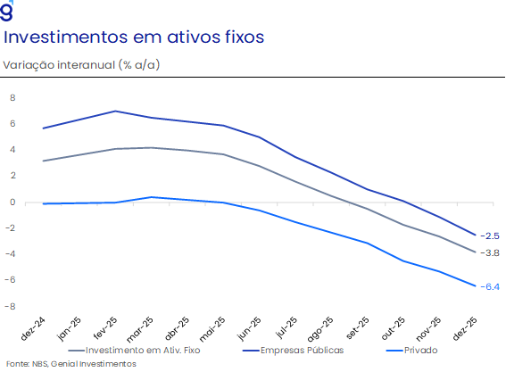 Por fim, a queda acentuada do investimento em ativos fixos reforça o diagnóstico de fragilidade da confiança doméstica. No quarto trimestre, os investimentos recuaram 12,8% a/a, aprofundando a contração observada no trimestre anterior (-6,2% a/a), refletindo sobretudo a queda de 29,4% a/a no investimento imobiliário. Também contribuíram negativamente os recuos em infraestrutura (-13,4% a/a) e manufatura (-7,3% a/a). No acumulado de 2025, o investimento em ativos fixos caiu 3,8%, desempenho significativamente pior do que o esperado pelo mercado (+3,1%, Bloomberg) e marcando a primeira contração anual da série. Tanto os investimentos de empresas estatais quanto privadas encerraram o ano em queda, indicando que o enfraquecimento foi bastante disseminado.