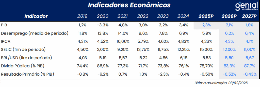 O fiscal de 2025 deteriorou na margem (déficit primário 0,78% do PIB; déficit nominal 8,34%), com cumprimento de meta dependente de receitas extraordinárias e ajustes. Para 2026, projetamos déficit em torno de 0,5% do PIB e estimamos necessidade de ~R$ 15 bi de esforço adicional. Com ciclo eleitoral, a chance de ajuste estrutural do gasto é baixa. Projetamos dívida bruta em 83,3% do PIB em 2026, mantendo prêmios pressionados. No político-eleitoral, pesquisas de janeiro indicam ganho de tração de Flávio Bolsonaro e reorganização do centro via PSD (Caiado; frente de governadores), mas seguimos vendo Lula como favorito, com eleição disputada e potencial de volatilidade.