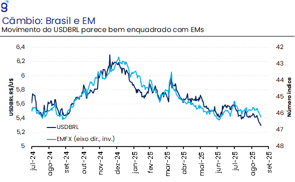 No campo da inflação, o curto prazo tem sido favorecido pela apreciação cambial, impulsionada principalmente pela desvalorização do DXY em meio às incertezas globais. Esse movimento contribuiu para o arrefecimento de grupos sensíveis ao câmbio, como alimentação e bens industriais, que vêm apresentando trajetórias favoráveis recorrentes nas leituras recentes do IPCA. Ainda assim, a combinação de um mercado de trabalho aquecido e do impulso fiscal adicional com o pagamento de precatórios segue exigindo atenção especial ao grupo de serviços, cujas variações mais recentes têm sido distorcidas por efeitos pontuais, especialmente no núcleo (como cinema e seguro de veículos). Além disso, o bônus de Itaipu respondeu pela deflação observada na energia elétrica em agosto, impactando tanto o IPCA-15 quanto o IPCA cheio do mês.
