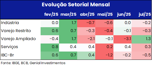 Em contrapartida, o setor de serviços manteve relativa resiliência, crescendo 0,3% m/m em julho e renovando o maior nível de sua série histórica, sustentado por informação e comunicação, serviços às famílias e profissionais. Ainda assim, a média móvel de três meses confirma perda gradual de dinamismo, compatível com o cenário macro adverso. No agregado, os indicadores de julho reforçam nossa leitura de que a economia entrou em trajetória de arrefecimento após o impulso inicial do 1T25, com o consumo doméstico ainda amparado pelo mercado de trabalho aquecido e pela política fiscal expansionista, mas contrabalançado pelos efeitos defasados da política monetária restritiva. Mantemos, por ora, a nossa projeção de crescimento de 0,5% t/t da economia no 3T25 e de 2,3% no ano.