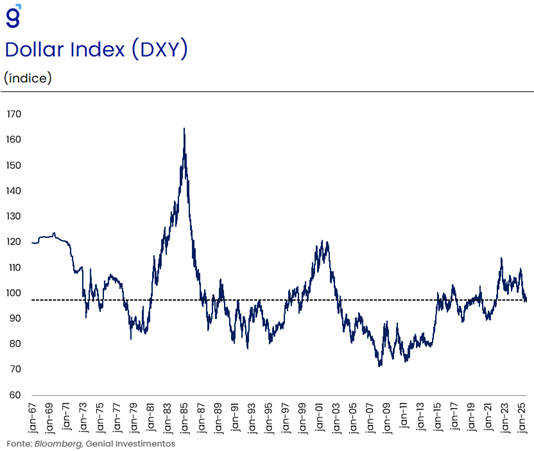 A política de dólar fraco praticada pela administração Trump, junto com as tarifas de importação têm o objetivo de reduzir o déficit comercial dos EUA contra o resto do mundo. No entanto, o dólar (DXY) ainda segue acima da sua média história, havendo ainda margem para a continuidade do processo de desvalorização. Além disso, a política de afrouxamento monetário que o banco central norte americano (Fed) pode vir a implementar favorece ainda mais esse movimento. Como resultado desses dois fatores, a atividade econômica e a inflação devem ganhar um impulso extra, não havendo motivos para esperar uma recessão nos EUA e uma desinflação persistente e prolongada.