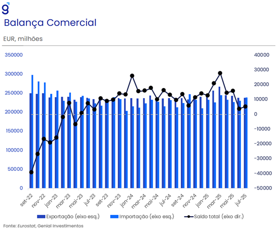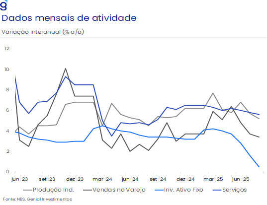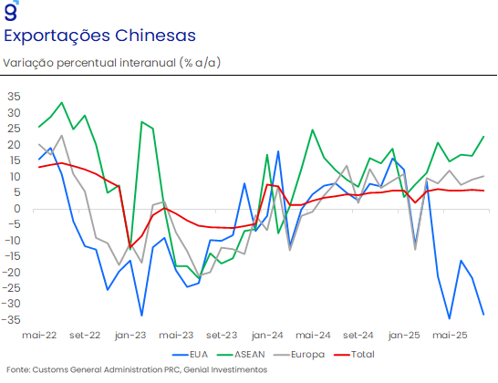 Também merece destaque a perda de dinamismo nas vendas de serviços, que passaram de 5,8% a/a em julho para 5,6% em agosto, reforçando nossa leitura de que o baixo nível de confiança doméstica continua a limitar o consumo local. Em nossa avaliação, a combinação entre a crise prolongada do setor imobiliário e as tensões comerciais com os EUA tende a manter um ambiente adverso à demanda, exigindo estímulos adicionais para evitar uma desaceleração mais acentuada nos próximos meses.