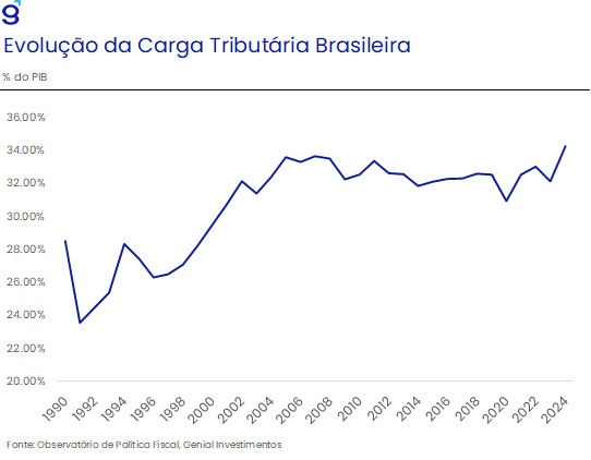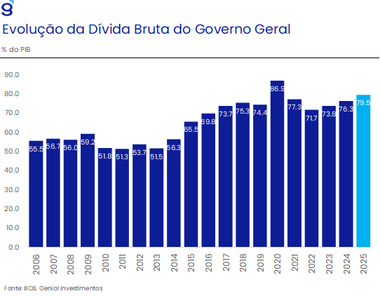 No campo fiscal, o governo manteve ao longo de 2025 uma estratégia baseada na expansão do gasto público e no aumento da carga tributária como principal instrumento de recomposição de receitas. Entre 2023 e 2024, a carga tributária avançou de cerca de 32% para 34% do PIB, movimento que se estendeu parcialmente em 2025. Ainda assim, o esforço arrecadatório mostrou-se insuficiente para conter a deterioração da dívida pública, cuja relação dívida/PIB avançou cerca de 7,8 p.p. desde o início do governo Lula III, atingindo aproximadamente 79,5% do PIB.