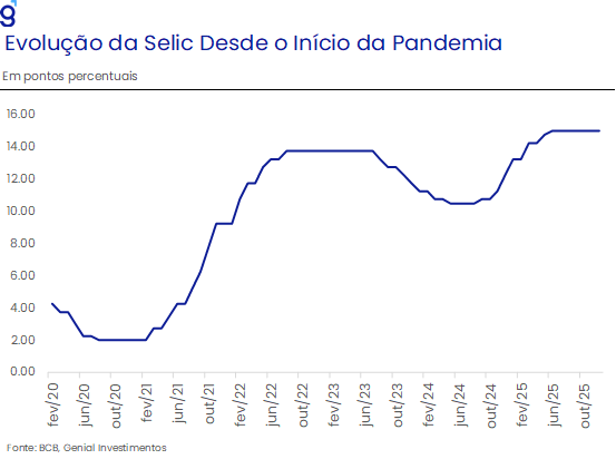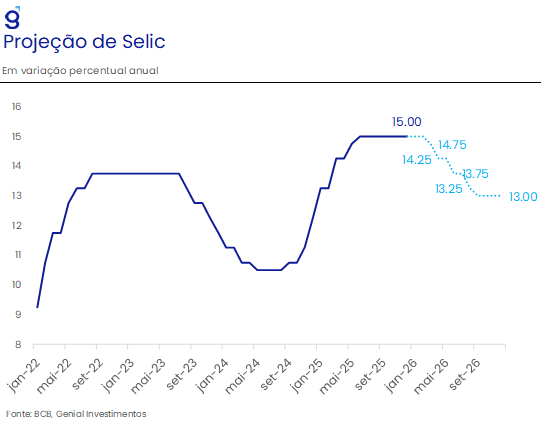 Caso nosso cenário base se concretize, o Banco Central seria surpreendido por uma inflação que volta a se acelerar no final do primeiro semestre de 2026, sendo forçado a interromper o ciclo de corte de juros. Nesse contexto, projetamos que a Selic deva encerrar 2026 em 13,0%, com o ciclo de corte sendo interrompido por essa escalada inflacionária. Para essa projeção, o balanço de riscos segue mais baixista devido a possibilidade de que o IPCA se mostre mais benigno ao longo do primeiro trimestre do ano, potencialmente intensificando o ciclo de cortes no início do ano. Além disso, podemos destacar também o risco de um enfraquecimento adicional do DXY refletindo a agenda econômica adotada pelos EUA ao longo do ano, contribuindo para reduzir a pressão sobre o câmbio e, consequentemente, gerando uma trajetória mais benigna de inflação.