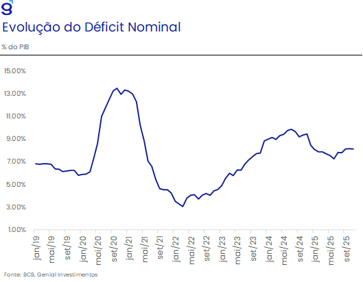 Apesar disso, o resultado primário apresentou leve melhora no curto prazo, beneficiado pela resiliência da atividade econômica, pela surpresa positiva do mercado de trabalho e pela aprovação de medidas adicionais de arrecadação. A expectativa de déficit primário para 2025 foi revisada marginalmente, de -0,6% para cerca de -0,5% do PIB. Após ajustes contábeis autorizados pelo STF, o governo conseguiu cumprir formalmente a meta estabelecida na Lei de Diretrizes Orçamentárias. No entanto, esse cumprimento não alterou o diagnóstico central: a política fiscal permaneceu incapaz de estabilizar a dívida pública, dada a ausência de reformas estruturais pelo lado das despesas e o elevado custo de carregamento da dívida em um ambiente de juros altos.