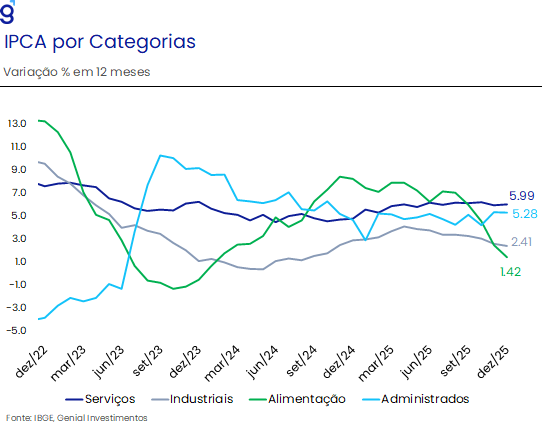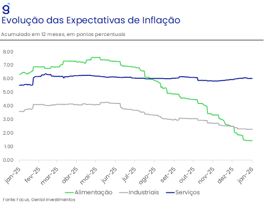 Ainda assim, a dinâmica inflacionária mostrou-se mais benigna do que o projetado no início do ano. A inflação acumulada em 12 meses, cuja expectativa inicial era de cerca de 5,5%, recuou gradualmente ao longo de 2025, encerrando o ano em 4,3%. Esse movimento refletiu sobretudo fatores cíclicos e externos, como a apreciação cambial observada nos três primeiros trimestres do ano, a normalização dos preços de alimentos após os choques de 2024 e a desinflação de bens industriais, favorecida pelo câmbio mais apreciado e pela maior oferta global, em especial da China. Importantes fatores de risco pelo lado da oferta não se materializaram, como a virada do ciclo pecuário, que sozinho poderia ter mais do que compensado esses fatores, fazendo com a inflação de 2025 saísse de 4,3% para 5,0%, e condições climáticas mais favoráveis. Ademais, a inflação de serviços encerrou 2025 em linha com o projetado pelo mercado em janeiro do ano passado, acumulando 6,0% a/a de alta. Isso sugere que, na ausência dos vetores baixistas de oferta e choques cambiais favoráveis, a inflação doméstica deveria ter encerrado 2025 mais próxima de 5,0%, perto das expectativas de mercado feitas no começo do ano.