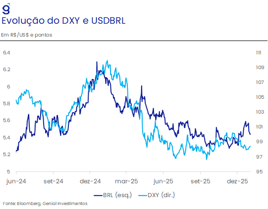 Neste contexto, os investidores estão prevendo entre duas ou três reduções da taxa básica de juros americana ao longo de 2026, ou seja, a expectativa consensual é de que a política monetária se torne mais expansionista, dando continuidade ao movimento de perda de valor do dólar. Entretando, alguns fatores podem vir a contrabalançar isso, como a rotação dos membros votantes entre os diferentes distritos regionais do Fed deve levar a uma composição levemente mais “hawkish” do que o antecipado e a possibilidade de que o novo presidente adote uma postura mais dura e distante da defendida pelo governo Trump. Esse cenário teria a capacidade de ao menos interromper a desvalorização do dólar no mercado financeiro internacional, podendo até revertê-la.