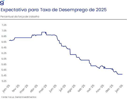 No que diz respeito à economia chinesa, os dados mais recentes seguem corroborando a perspectiva de desaceleração ao longo de 2026. A continuidade da crise imobiliária, a falta de confiança dos agentes privados e o esgotamento das políticas de estímulo à economia devem ser os principais fatores por trás da desaceleração da economia chinesa que deve sair de um crescimento próximo a 5,0% em 2025 para 4,5% em 2026. Assim como observado em 2025, a persistência de uma demanda doméstica fraca em um contexto marcado pelo excesso de capacidade produtiva deve dar continuidade ao processo de escoamento de bens industriais para outras economias, sendo este um importante fator que contribuiu para o processo de desinflação global no ano passado.