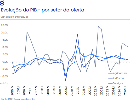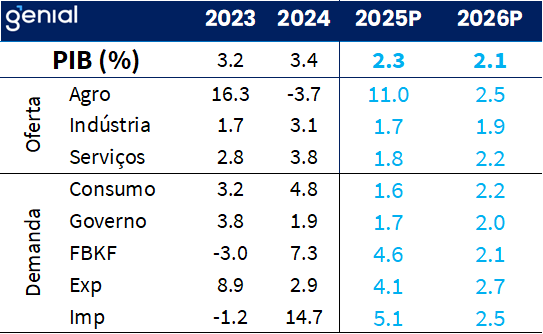 Do ponto de vista da atividade econômica, o PIB deve fechar o ano de 2025 com um crescimento próximo a 2,3%, desempenho superior às projeções iniciais e consistente com revisões mais recentes do consenso. A composição do crescimento, no entanto, foi assimétrica: enquanto setores mais sensíveis às condições financeiras desaceleraram, em linha com o nível de contração da política monetária, a agropecuária teve papel relevante na sustentação do PIB, beneficiada por condições climáticas favoráveis e demanda externa robusta em função das tensões comerciais entre os EUA e a China.
