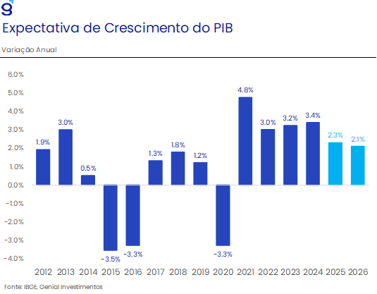 Em relação ao cenário doméstico, o risco fiscal, as eleições e o comportamento do dólar globalmente serão fundamentais para a determinação da trajetória das principais variáveis econômicas. O nosso cenário base contempla uma relativa estabilidade no desempenho da economia em relação ao que foi observado em 2025. Esperamos por um crescimento do PIB de 2,1% no ano, ficando muito próximos aos 2,3% que devem ser registrados no ano passado. Por um lado, os efeitos defasados da política monetária contracionista devem seguir limitando, ainda que parcialmente, o desempenho dos segmentos mais cíclicos da economia. Por outro, a entrada de novas medidas de impulso fiscal, com destaque para a isenção de imposto de renda e o reajuste do salário-mínimo em termos reais devem contribuir para que a demanda doméstica seja o principal driver de crescimento no ano. De acordo com as nossas estimativas, essas medidas e as demais já aprovadas pelo governo devem contribuir com cerca de 1,3 p.p. do crescimento de 2026, compensando o impacto da política monetária contracionista.
