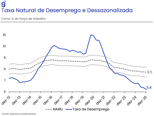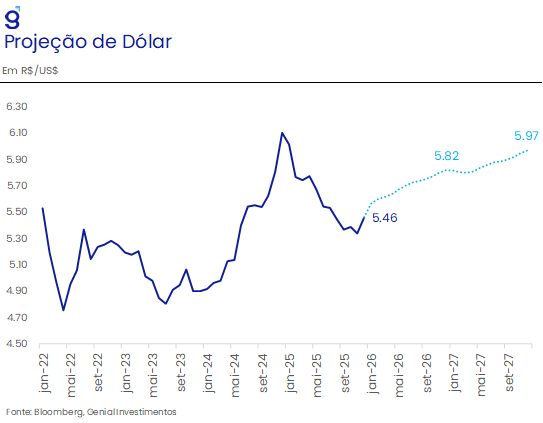 Dada essa percepção, entendemos que o Comitê seguirá adotando essa estratégia, cuja importância se tornou ainda maior no final de 2025, conforme os desdobramentos eleitorais pressionaram a taxa de câmbio, promovendo uma desvalorização de cerca de R$ 5,30 USD/BRL para R$ 5,53 USD/BRL. Vale destacar que somente essa depreciação já seria suficiente para elevar a projeção do modelo estrutural do Banco Central de 3,2% de inflação no horizonte relevante para cerca de 3,4%, fechando o espaço para possíveis antecipações do ciclo de cortes.