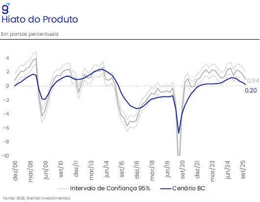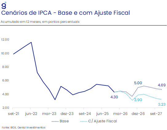 Em relação à dinâmica inflacionária, avaliamos que, em nosso cenário base, sob a hipótese de que a taxa de câmbio se depreciará para R$ 5,82 USD/BRL, o IPCA deve apresentar alta de 4,3% em 2025 para 5,0% em 2026, refletindo os seguintes fatores: i) aumento das políticas de transferências em termos reais; ii) hiato do produto positivo; iii) efeito riqueza advindo do estoque de dívida pública e pagamento de juros; e iv) taxa de juros neutra mais elevada. Nessa projeção, os principais riscos de baixa incluem uma perspectiva de continuidade da queda nos preços das principais commodities em reais, enfraquecimento mais forte do mercado de trabalho e uma apreciação do Real e/ou queda da taxa neutra de juros decorrente de um cenário eleitoral mais inclinado à alternância de poder. Em contrapartida, os riscos de alta incluem a virada do ciclo pecuário, uma política fiscal mais expansionista e uma depreciação mais intensa do câmbio do que o antecipado.